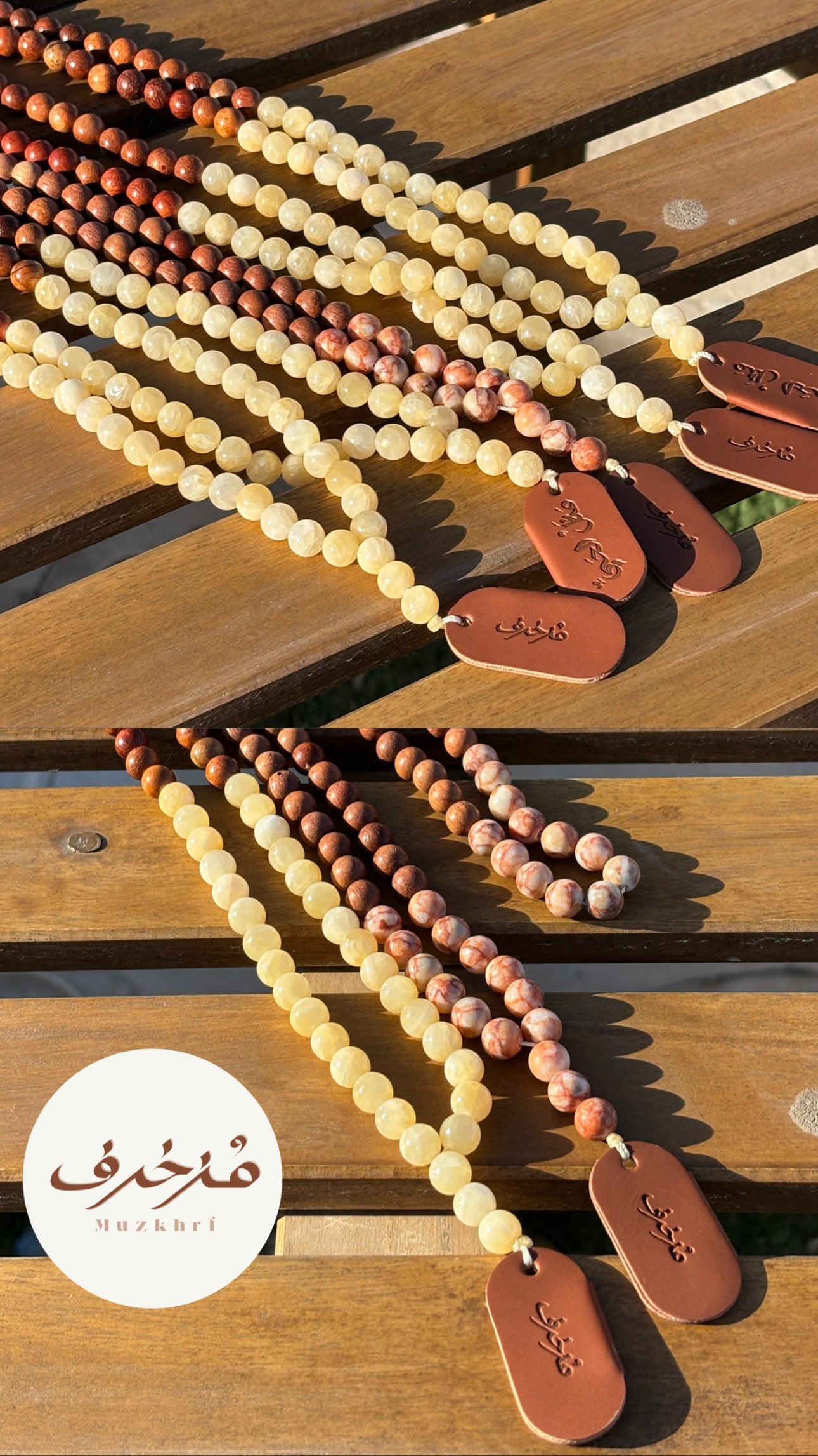 مسباح أنيق مصاغ يدويًا بعناية على يد مختص في صناعة المسابيح يجمع بين الأحجار الكريمة بألوانها الفريدة والخشب الطبيعي بملمسه الدافئ، ليمنحك تجربة استخدام مريحة ومتوازنة