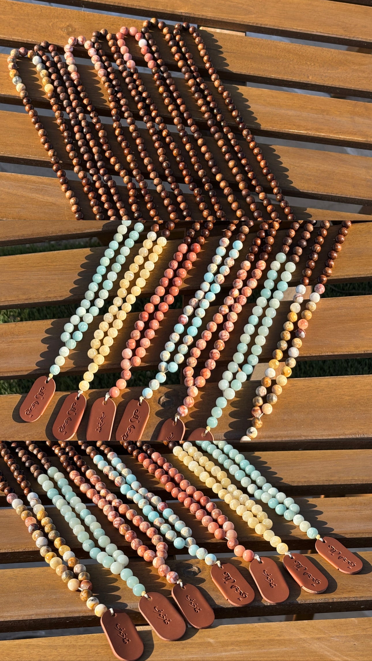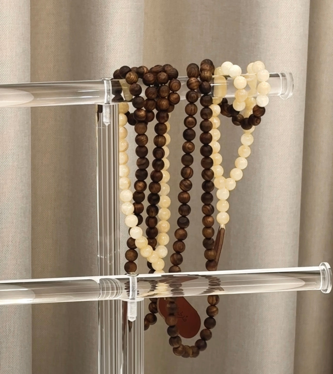 مسباح أنيق مصاغ يدويًا بعناية على يد مختص في صناعة المسابيح يجمع بين الأحجار الكريمة بألوانها الفريدة والخشب الطبيعي بملمسه الدافئ، ليمنحك تجربة استخدام مريحة ومتوازنة